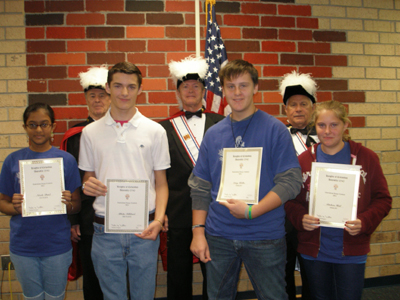 The Knights of Columbus Color Corps of the 4th Degree from Our Lady of the Rosary Assembly #2542 presented the winners of their Patriotic Essay Contest at Three Oaks Middle School on December 5. Connie Harris, Language Arts teacher, headed the project for the school under the supervision of Principal Michael Carson, and coordinated the combined Language Arts and Social Science faculties. The Knights developed a patriotic-themed topic for the subject of the essay contest, and this year it was the Thomas Jefferson quote